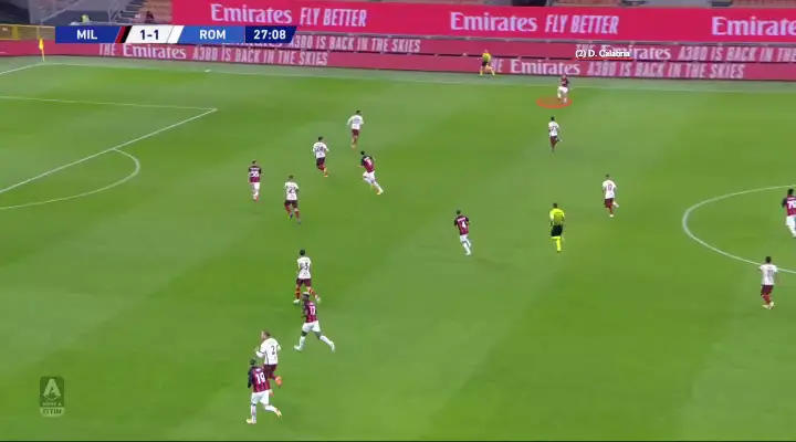For instance, in the example below, Rafael Leão is able to find some space on the left-hand side of the pitch, where he subsequently receives a pass from Hakan Çalhanoğlu. He controls the ball and advances with it before moving into another pocket of space (benefitting from the laxness of the Roma defenders to close him down) and lifting an inch perfect ball for Ibrahimović to get on the end of and open the scoring.